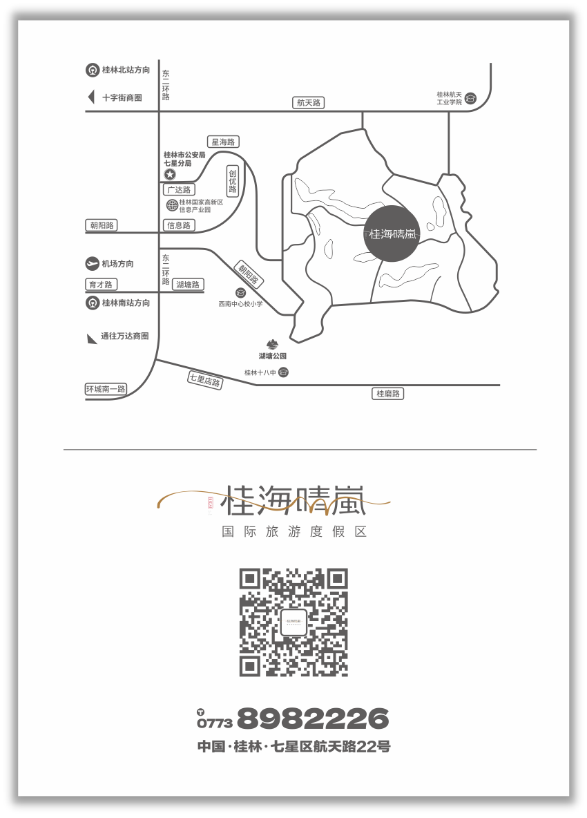 桂海晴嵐國際旅游度假區(qū)位于桂林市七星區(qū)航天路22號,占地面積為2.29平方公里。毗鄰國家4A級景區(qū)堯山,依托得天獨(dú)厚的自然風(fēng)光,打造以藝術(shù)文化為核心的休閑度假綜合體。