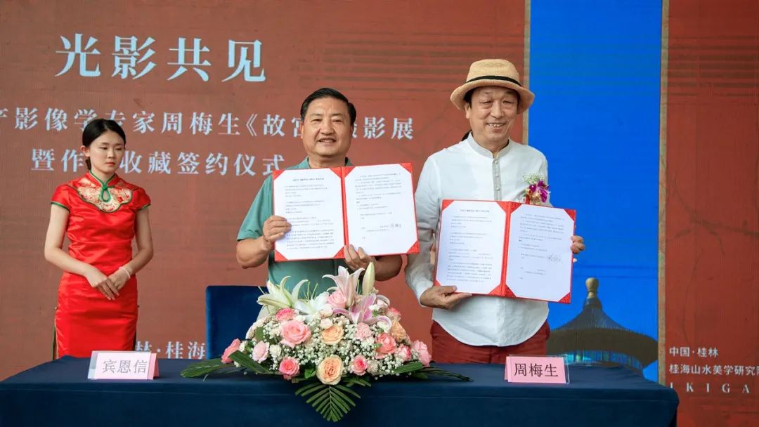 儀式的最后,攝影作品收藏嘉賓信昌集團(tuán)董事長/桂林桂海山水美學(xué)研究院理事長賓恩信先生,與攝影作品出讓嘉賓世界遺產(chǎn)影像學(xué)專家周梅生先生正式簽署收藏協(xié)議,并進(jìn)行作品交接儀式。