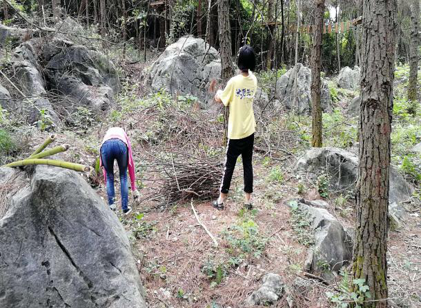 清場(chǎng):場(chǎng)地路面的枯枝與雜草處理。先是樹(shù)上的枯藤殘刺,身高不夠,我們就穿上裝備去到平臺(tái)上切割。地上雜草叢生,我們就一棵一棵的連根拔起。然后找來(lái)鮮騰捆好,一捆捆的背下山來(lái)。排除一切的蛇鼠蟲(chóng)蟻,為游客的舒心加把安全鎖。